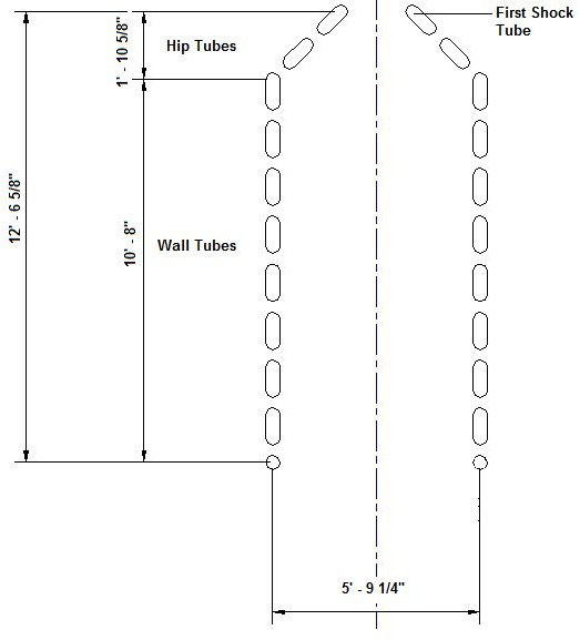 We will first start with the first hip tube starting below the shock row, and will assume 4 hip tubes total or 2 per side. This will give a hip width of three spaces on a 45° Angle, with each space being the standard two nominal diameters, or 8”. So the hip width = 3 * 8 * 0.7071 (Sine of 45°) = 16.9704”. This results in a tube centerline to tube centerline = 16.9704 + 3 * 8(convection tubes) + 16.9704 = 57.9408”.